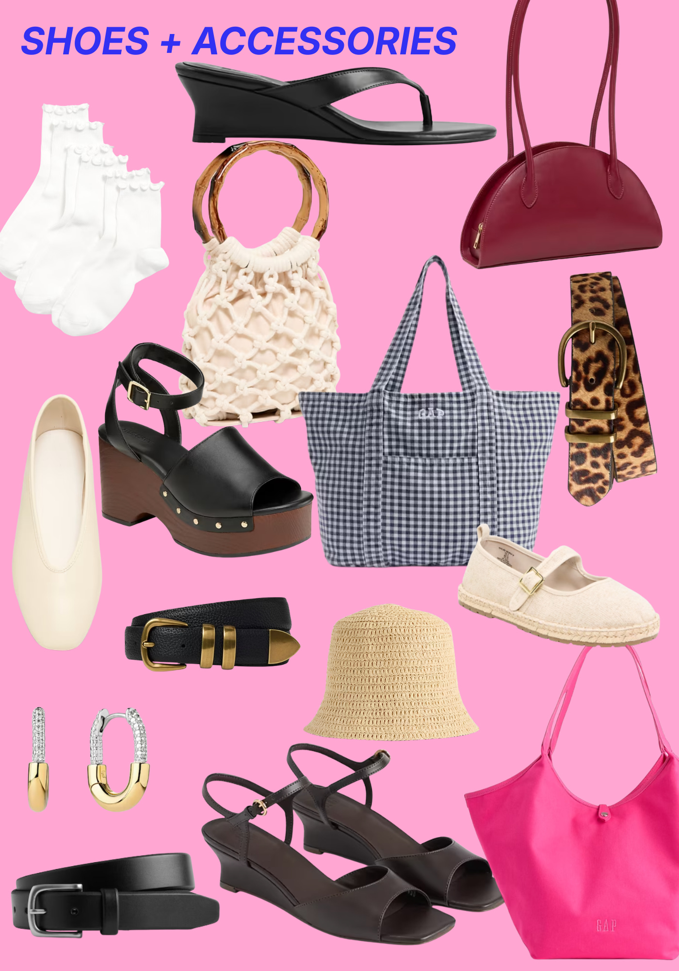 Thong wedge sandals | 3-pack ruffle socks | Crochet bag with bamboo handle (ok Gucci vibes) | Burgundy east-west shoulder bag | Cream v-shape ballerinas (size down!) | Studded platform wedge sandals | Gingham tote | Leopard belt |Tan espadrilles | Ana luisa earrings | Black and gold belt | Black and silver belt | Wedge strappy sandals | Hot pink tote